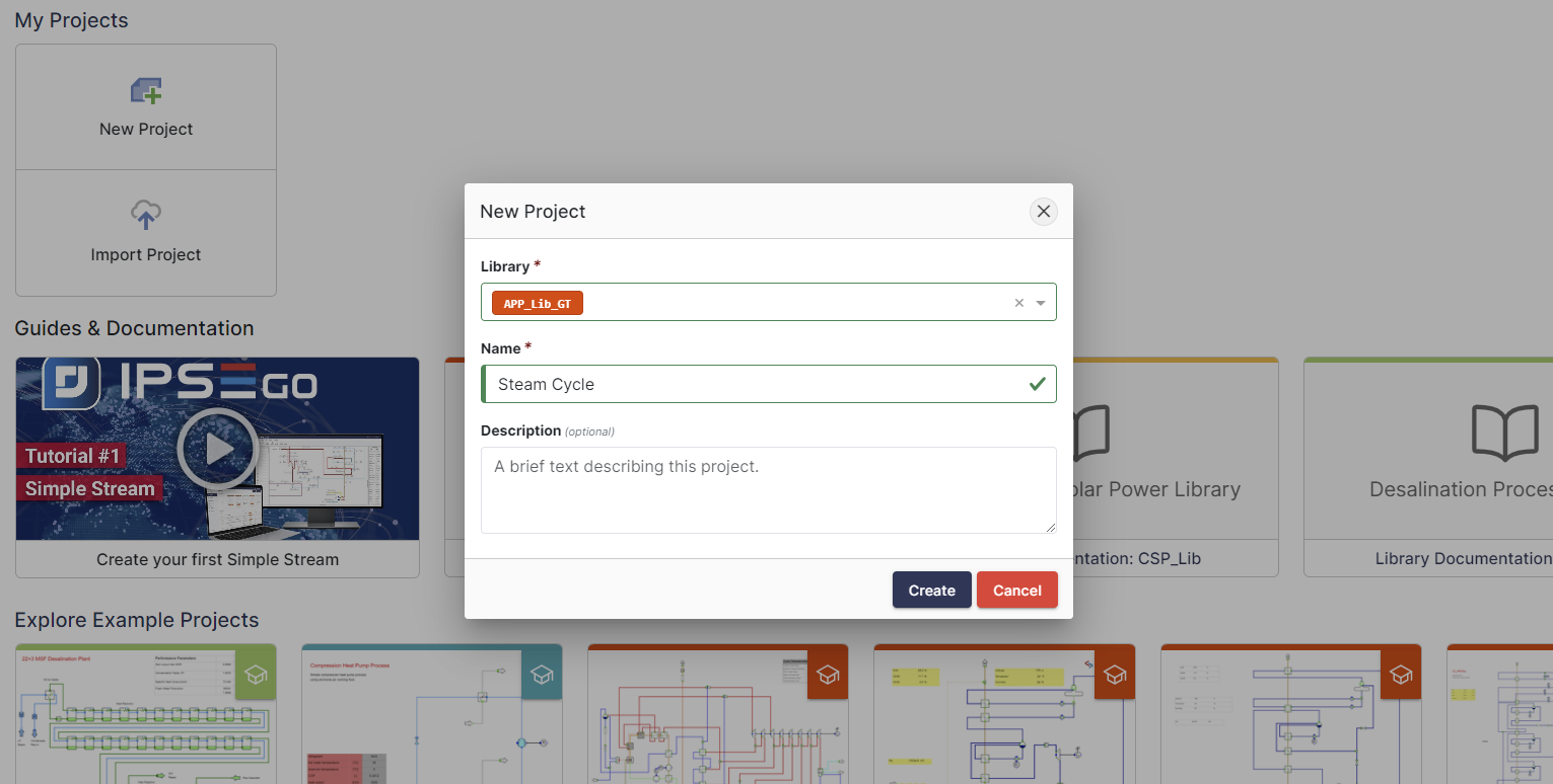 The first thing we need to do is to create a new project in IPSE GO. This can easily be done by clicking on “New Project” in the IPSE GO dashboard. You will see the following window and can now select the library and choose a project name: