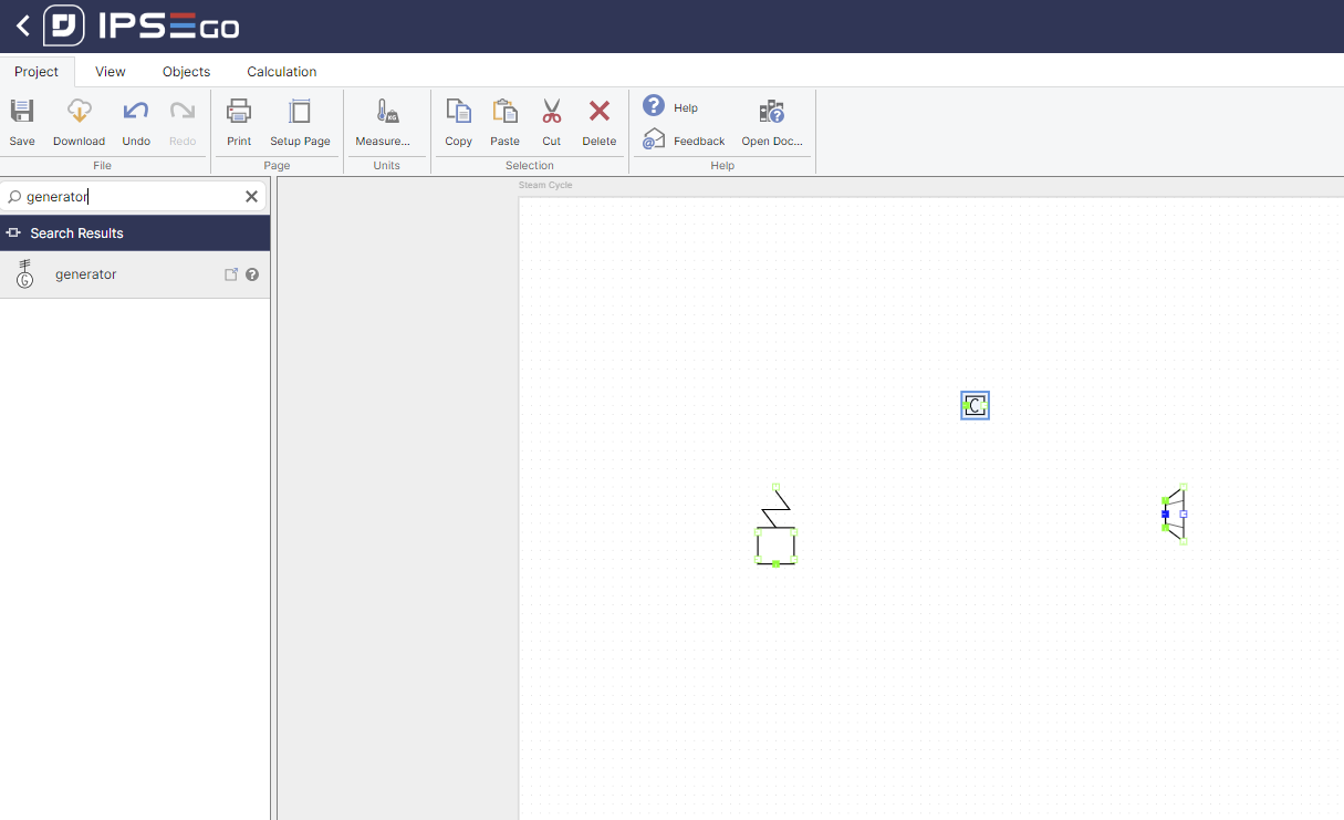 To draw the steam cycle, we can search for all of the needed components in the icon menu and simply add them to our project by clicking once on the icon in the icon palette, moving the cursor to the project window and clicking again once on the position where we want to place our icon.