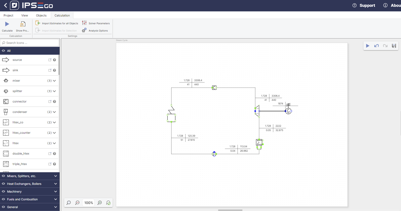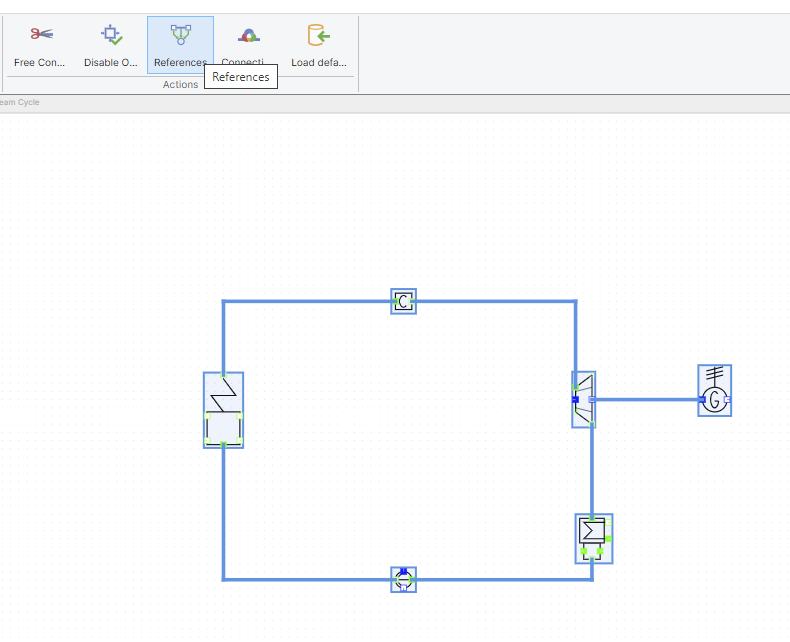For our steam cycle we need a boiler, a connector, a turbine, a generator and a pump connected via streams. The complete cycle should look something like this: